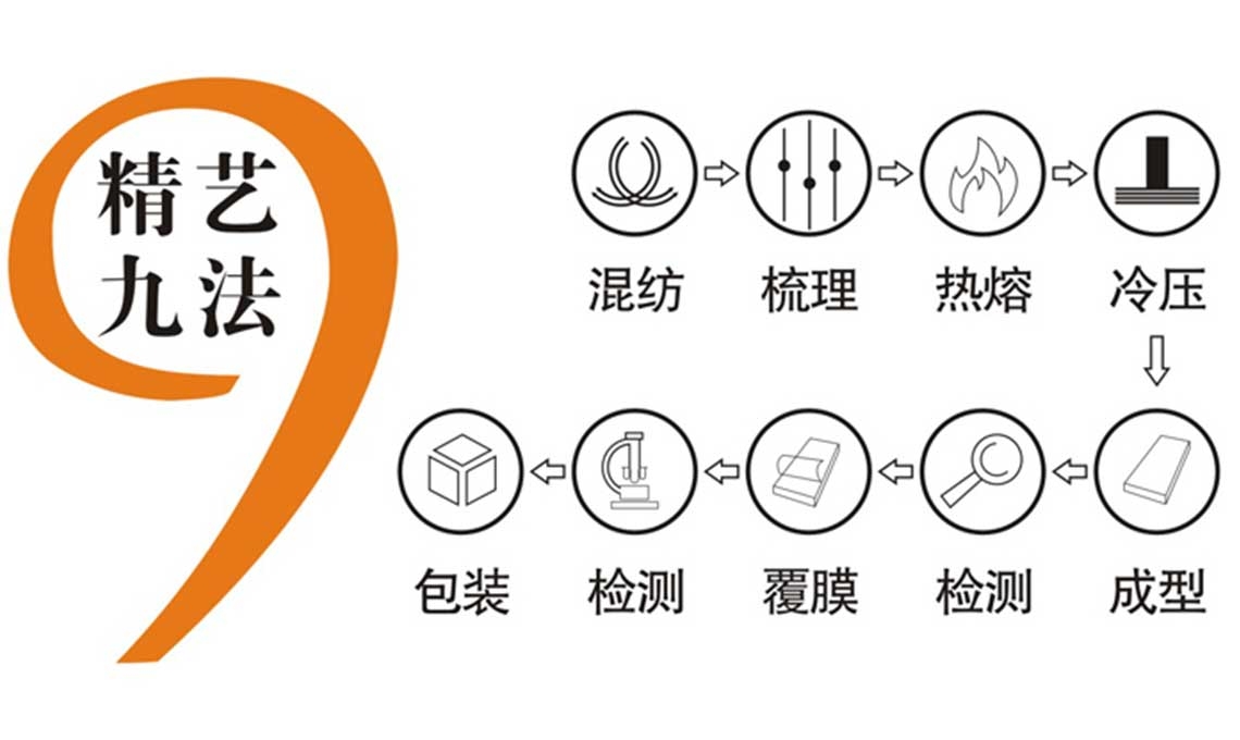 森佰汇航空纤维墙咔将增强型复合纤维通过真空循环混纺、精细梳理、通过90~120秒超240°C高温及200吨高压热熔处理,芯材冷却后再重复加乐使其质地更加细致均匀。以便于每一块成品墙板都能通过密度、导热系数、燃烧性能、吸水率等各项严苛测试。